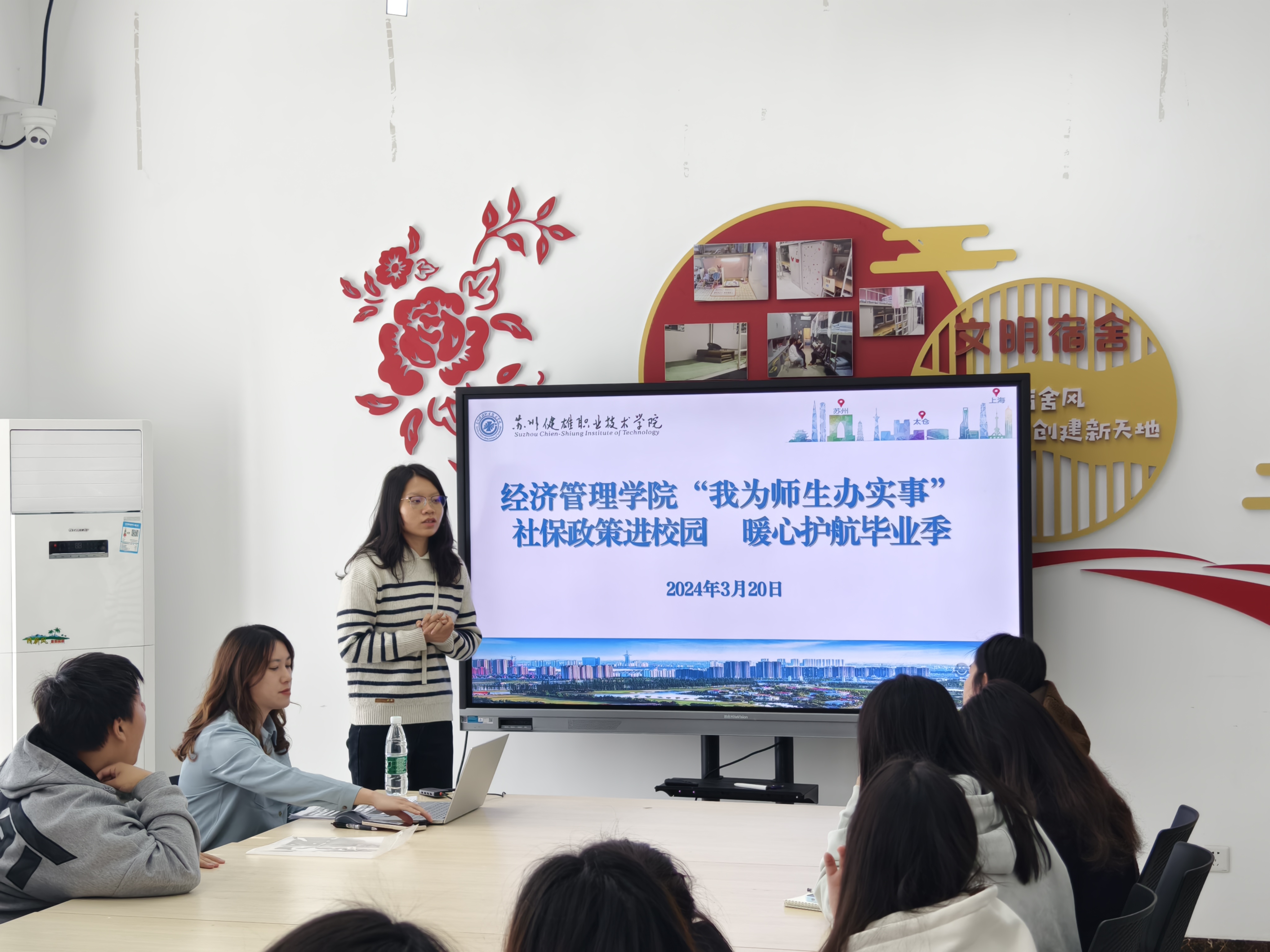 为广泛普及社保政策,激发毕业生参加社会保险的积极性和主动性,帮助毕业生更好了解关于社会保险相关政策内容,经济管理学院于3月20日在紫薇社区开展“社保政策进校园 暖心护航毕业季”活动。本次讲座邀请太仓市人社局社保中心王珅辰科长主讲,辅导员顾子琪老师和经济管理学院21、22级部分学生代表参加。