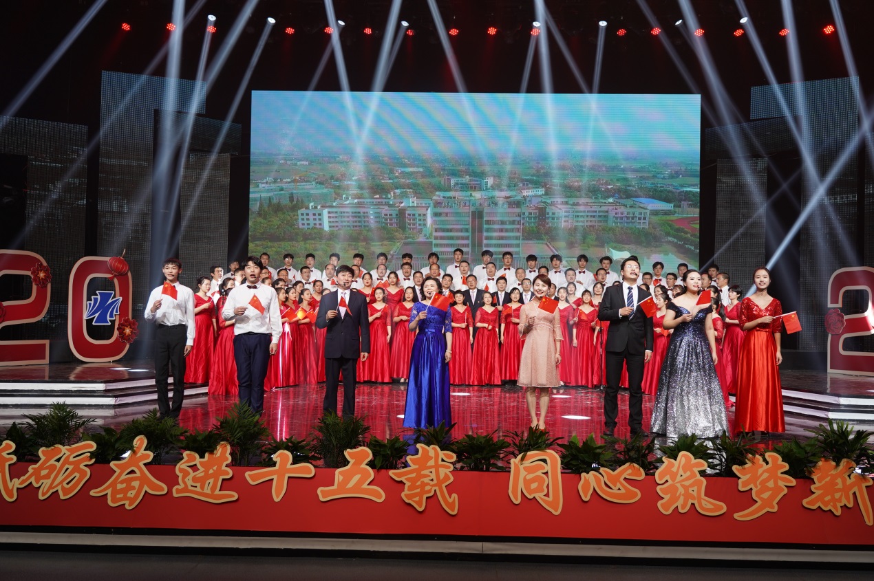 近2个小时的演出由缘聚健雄、情系娄东和梦圆时代三个篇章组成,共12个节目。演出的歌舞、相声、小品、合唱等都是教职工们自编、自导、自演的,反映了他们较高的艺术修养和对生活的热爱、对事业的追求和对学校的深情。演出在群舞《茉莉花开》中拉开序幕,参演的年轻女教师手持小雨伞翩翩起舞,仿佛一曲优美的水乡情歌,令人陶醉;相声《如此教授》通过幽默的语言、风趣的表演反映出我校今年取得的工作成绩,也反映出广大教职工立足岗位、奋勇争先的精神状态,给人留下深刻印象;小品《社招那些事》紧跟学校发展步伐,富有时代气息,艺术地再现了我校招生工作、职业教育工作蓬勃发展的美好景象;诗朗诵《盛世中国》气势磅礴,催人奋进,激励人们同心筑梦,奋斗新时代;拉丁舞《这时的我们》富有时代气息,让人们感受到年轻的力量、激情和希望。大合唱《我和我的祖国》把晚会推向高潮,“我和我的祖国,一刻也不能分离,无论我走到哪里,都流出一首赞歌……”这支由校领导带领全体中层以上干部合唱的歌曲唱出了全体师生的心声,她是2019年庆祝建国70周年回荡在健雄校园的主旋律。(图/文 何寿林)
