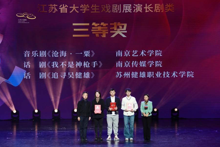 12月18日下午,由省委宣传部、省教育厅主办的2023江苏省大学生戏剧展演颁奖仪式在江苏大剧院举行,学院原创话剧《追寻 吴健雄》获长剧类作品三等奖,学院与南京艺术学院、东南大学等5所本科院校共同获得本次展演优秀组织奖。江苏省委宣传部副部长徐宁,省教育厅二级巡视员李金泉,省文联一级巡视员刘旭东,省文投集团总经理、党委副书记叶飚荣,省委宣传部文艺处处长高民,省教育厅体卫艺处副处长王红蕾等领导嘉宾出席活动并为获奖单位和剧目颁奖。学院党委委员、纪委书记赵勇代表学院参加颁奖典礼并上台接受表彰。